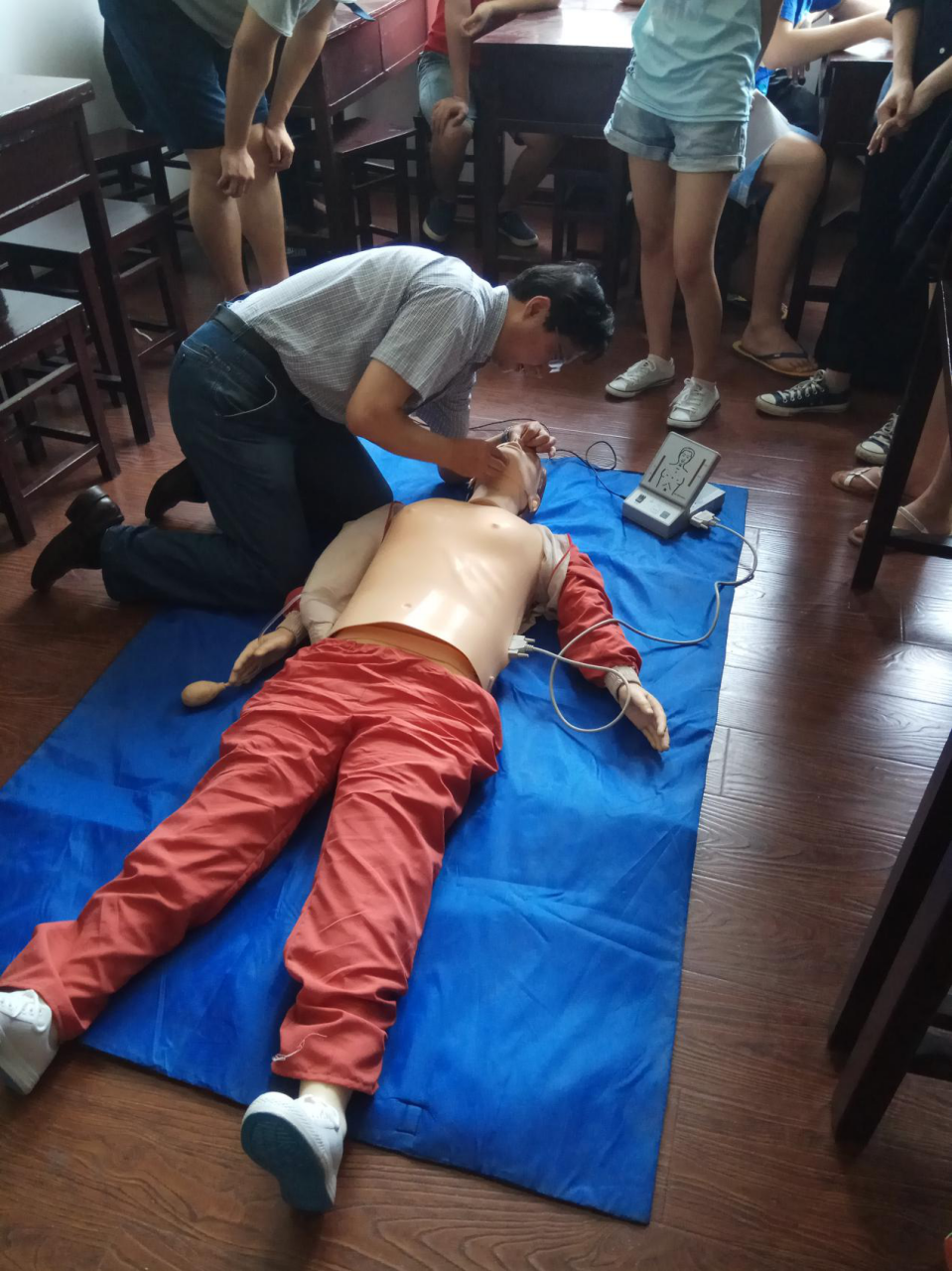 急救培训于下午两点半准时开始,首先,马经理讲授了先复苏后固定、先止血后包扎、先重后轻、现救后送、急救与呼救并重、搬运与医护一致、救人先救己的一系列急救技巧。接着向我们介绍了烧伤、溺水、触电、中暑、煤气中毒、乙醇中毒等生活中较可能遇到的现场救护知识。着重介绍了气道梗阻的救护方法,利用海氏手法进行有效自救和互救。