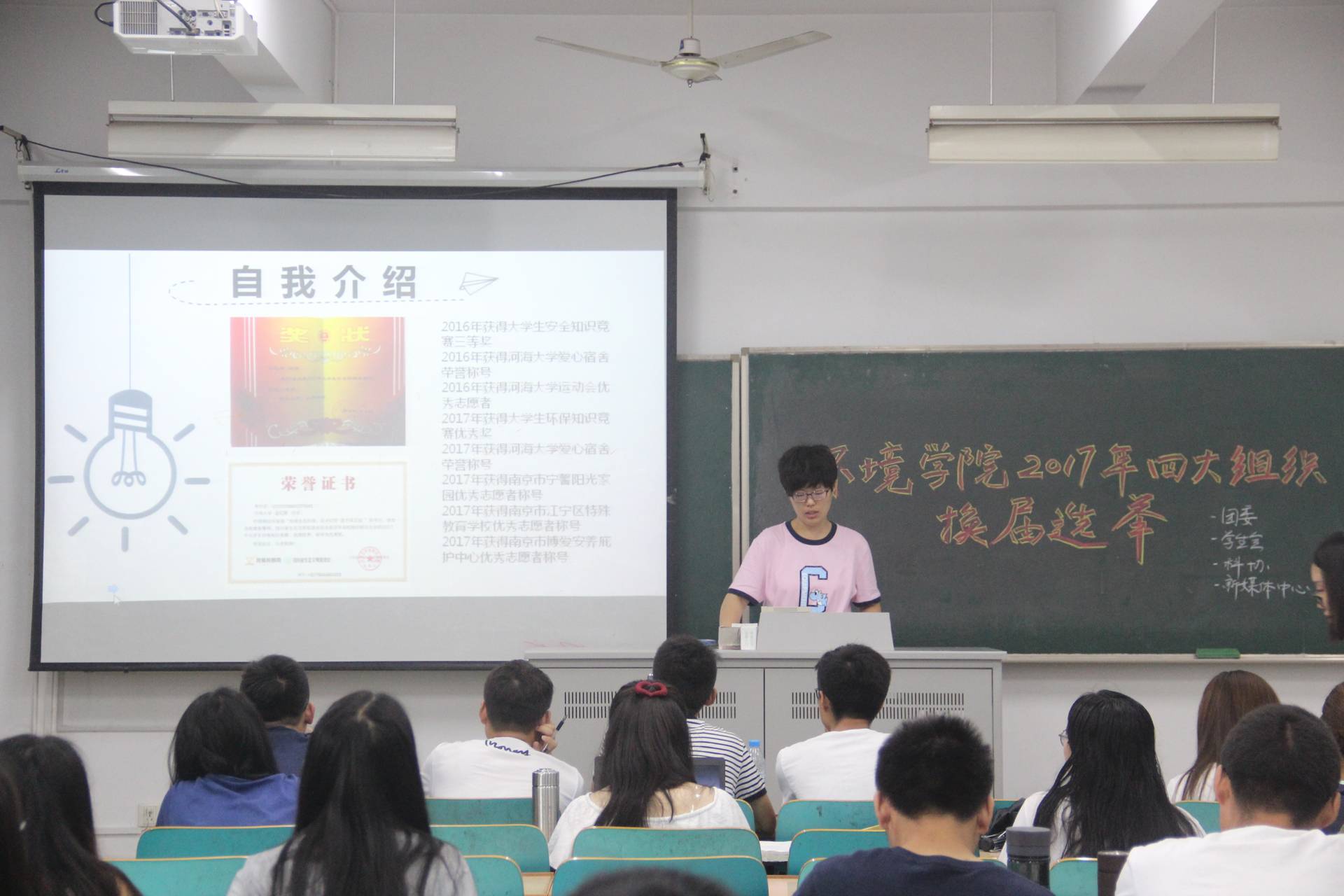 6月23日上午九点于致高216进行了部长副部长的竞选答辩。金意倩老师担任本次答辩的评委。同学们提前签到、拷好PPT后,按照团委、员工会、科协、新媒体中心的顺序依次进行答辩。每个答辩人都表现的精神抖擞,落落大方,将自己最好的一面展现给了各位评委,结束后同学们也给予了热烈的掌声。6月28号上午8:30于致用304教室进行了四大组织主席团的答辩。本场答辩的评委由曾莉老师和王剑老师担任。同学们答辩结束后老师依据答辩内容进行相应的提问。