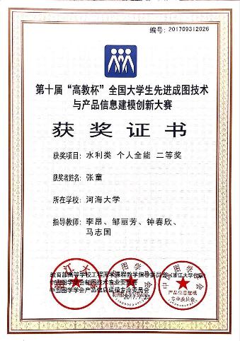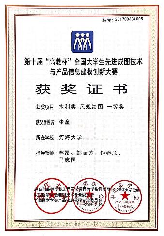由教育部高等学校工程图学教学指导委员会和中国工程图学学会制图技术专业委员会联合举办的第十届“高教杯”全国老员工先进成图技术、产品信息建模创新大赛于2017年7月21日~24日在兰州交通大学举办。公司2015级给排水科学与工程专业张童同学积极参与,经过选拔和培训,在港航院老师的指导下,荣获水利类尺规绘图一等奖,水利类个人全能二等奖以及水利类团体一等奖的好成绩。