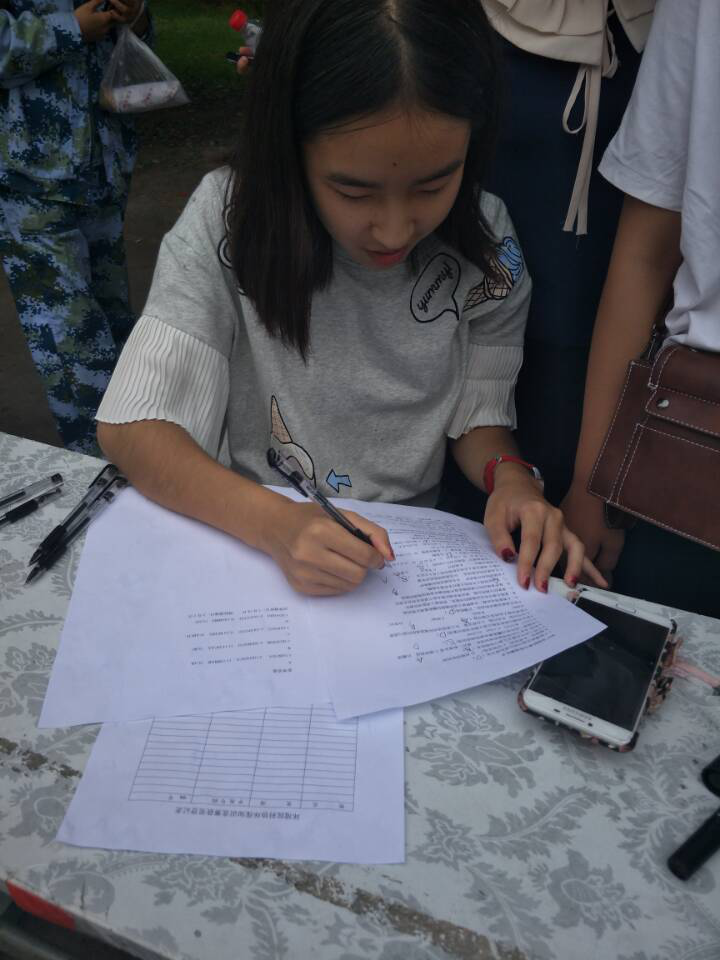 虽然天空不停的飘着小雨,但也没能湮灭同学们的热情参与。只见同学或蹙眉沉思,或挥笔如风……小到汽车尾气,大到全球生态问题,考卷内容瀚海拾珠,囊括颇多。活动组织者们也在一旁不停地忙碌着: 紧扣环境知识展开宣传,指导,讲解……天空放晴之时,活动也到了高潮,同学们兴致勃勃地在写有活动主题的横幅上签下了自己的名字,那每一笔每一画都是满满的认真。而这份虔诚,又吸引更多的同学投入其中。