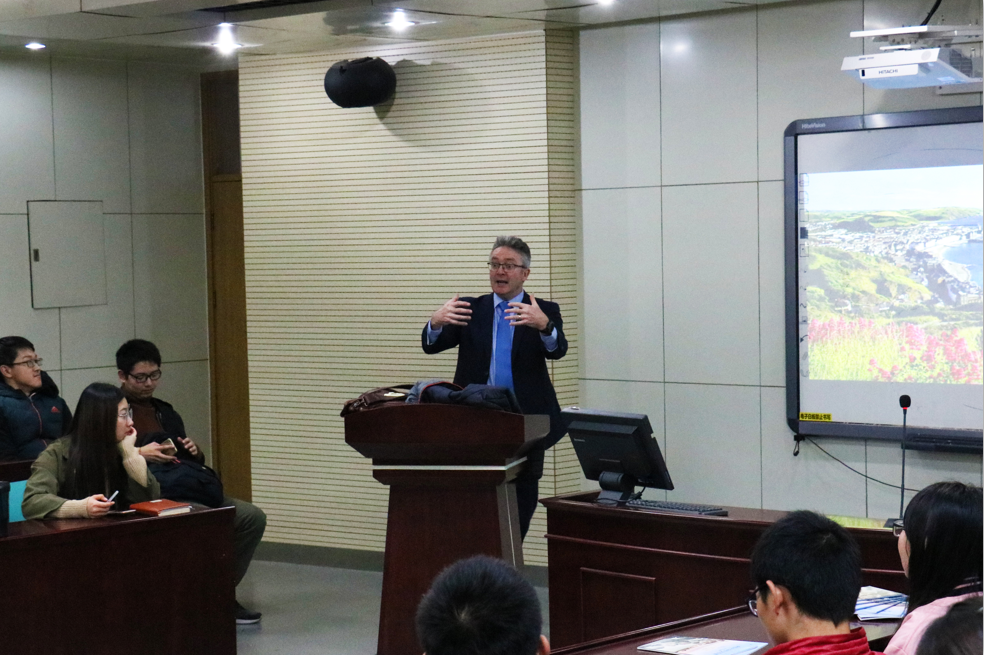 宣讲会开始前,John Grattan教授先给同学们展示了一小段介绍亚伯大学的视频。亚伯大学位于英国威尔士,大学分三个校区,依山傍海而建,有着英国其他大学无法比拟的独特地理优势。同时员工可独享全英第二的威尔士国家图书馆,是绝佳的学习胜地。杰出的研究教学质量、广泛的专业设置、一流的教学及体育设施以及优越的地理位置都是亚伯大学的特色。