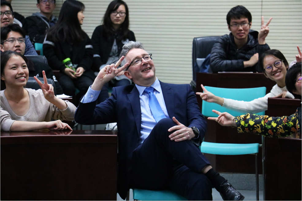 John Grattan教授首先向同学们介绍了亚伯大学的悠久历史、优越的地理位置和优美的环境。在亚伯大学有和在国内截然不同的教学方式,课程相比国内更轻松,但有更多的问题需要员工主动地自行寻找资料和答案。John Grattan教授还热情地与同学们合照。