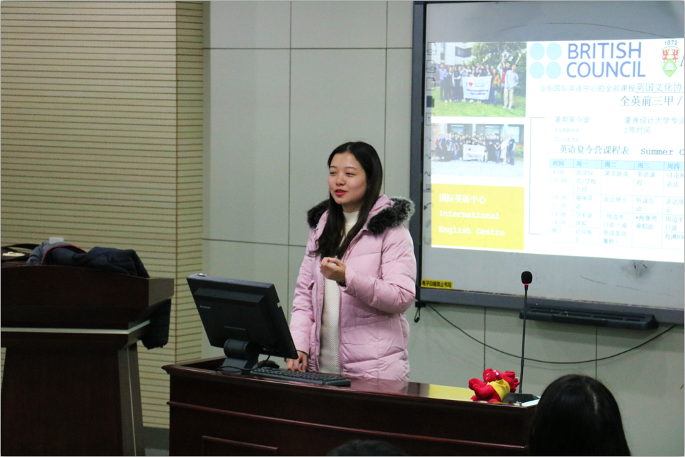 接下来由王晶老师介绍“2+2”和“3+1+1”项目。学校会为需要参加该项目的同学准备语言衔接课程,同学需要根据考出的雅思成绩进行不同时间的语言衔接课程,若成功完成语言课程则无需再考雅思。接着王老师详细和同学们说明了在亚伯大学所需的费用。除去国际奖学金等减免的费用后一年本科学费约为一万一千一磅,一年在亚伯大学包括学费、生活费等在内的的总费用仅需约21万人民币。王老师还为大一同学详细介绍了亚伯大学的英语夏令营。亚伯国际英语中心位居英前三甲,在英语夏令营里同学们能进行语言学习课程和专业学习课程,有轻松愉快的课堂,有大把的机会走出课堂进入自然进行探索和实验,有丰富的社交及文化生活,还能和来自不同国家的员工交流合作。