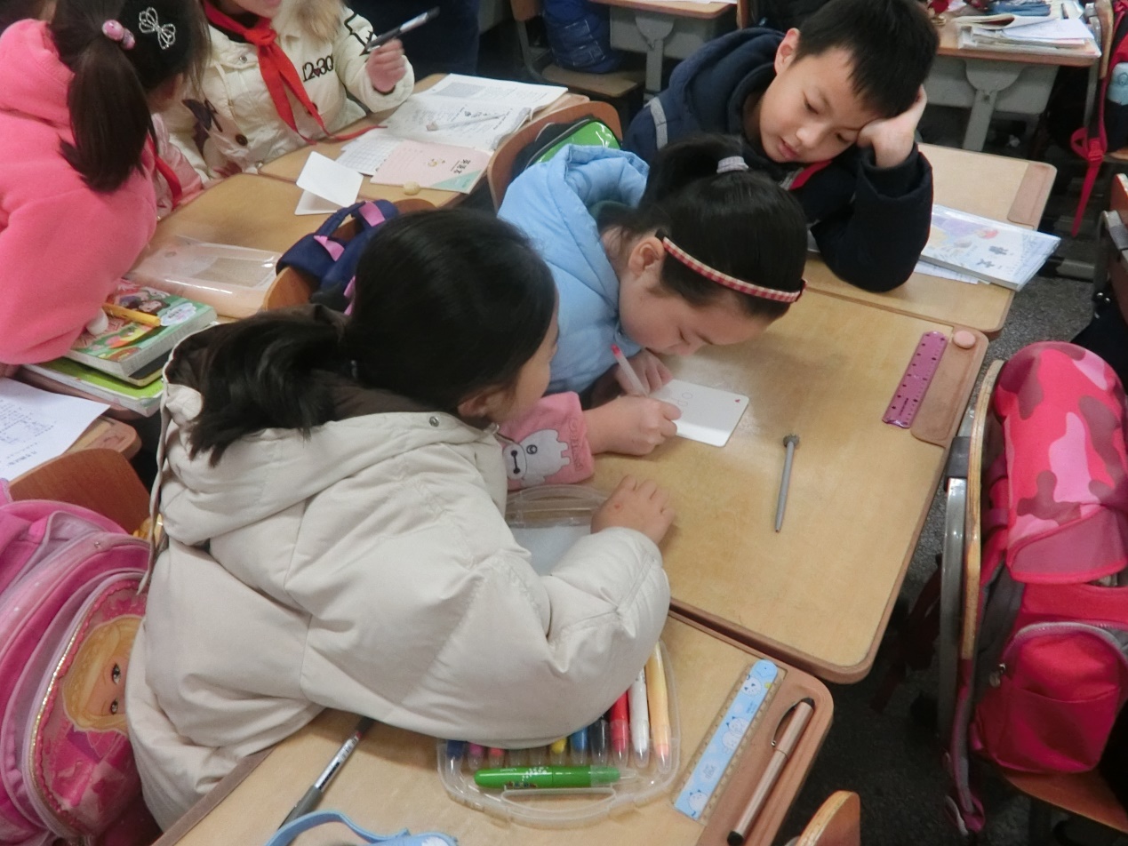 第二部分是动手环节。志愿者们将三个小朋友分为一组,给每一组派发了卡纸和贴纸,让小朋友们充分发挥想象力和动手能力,制作标语贺卡。十五分钟后,每个小组都做出了精美独特的贺卡。