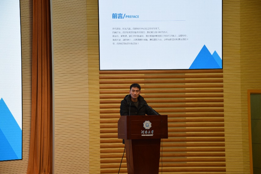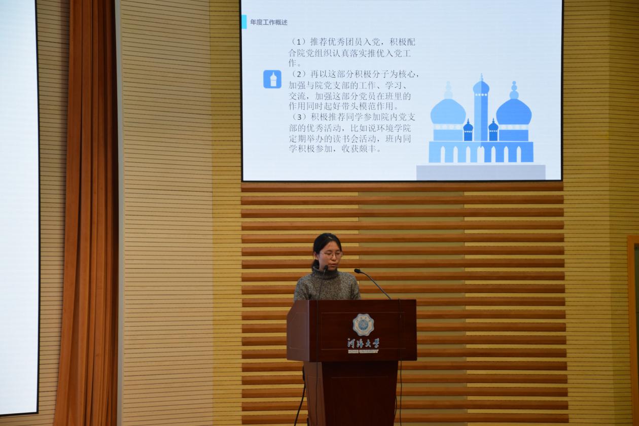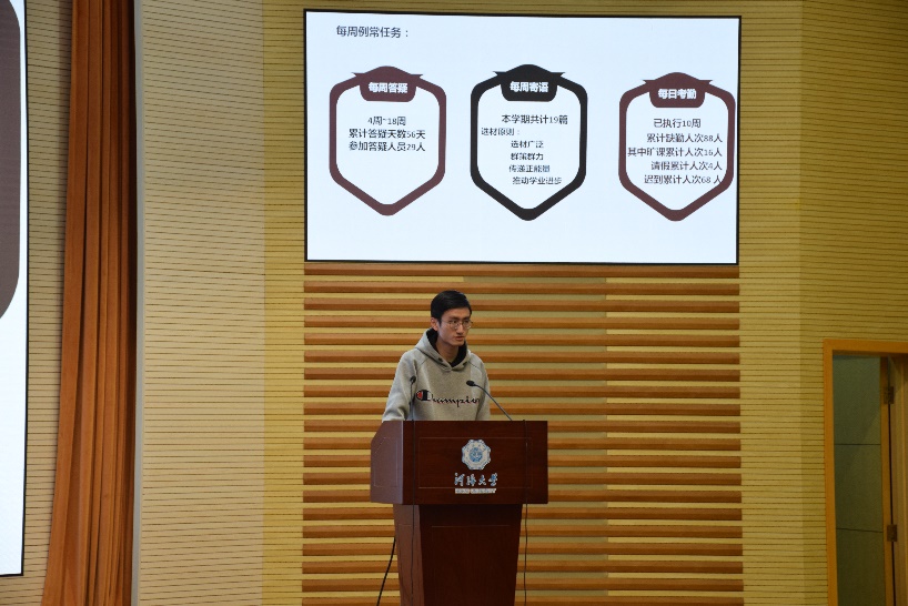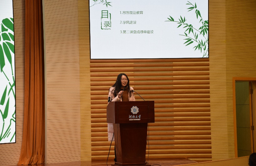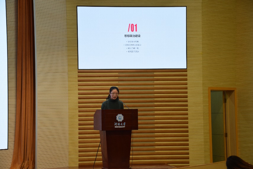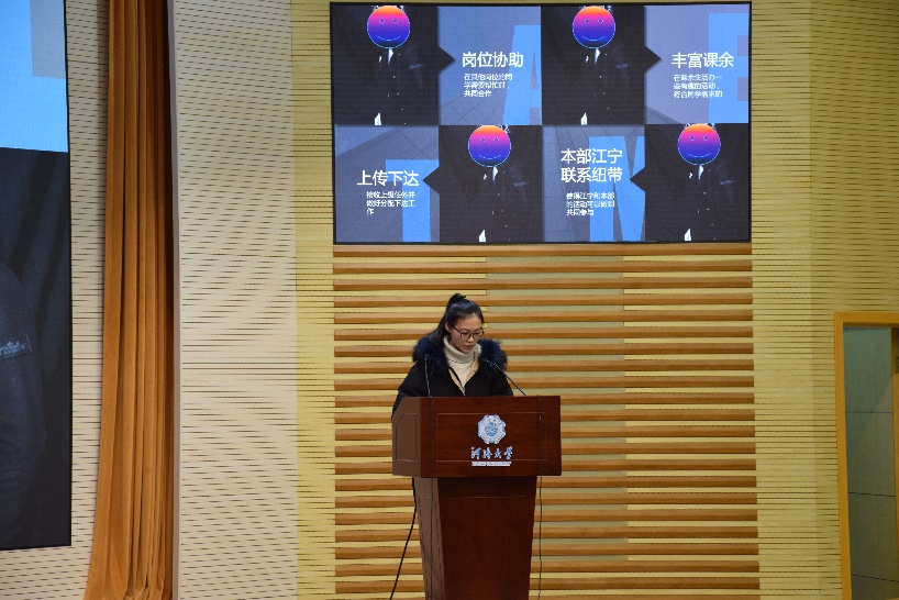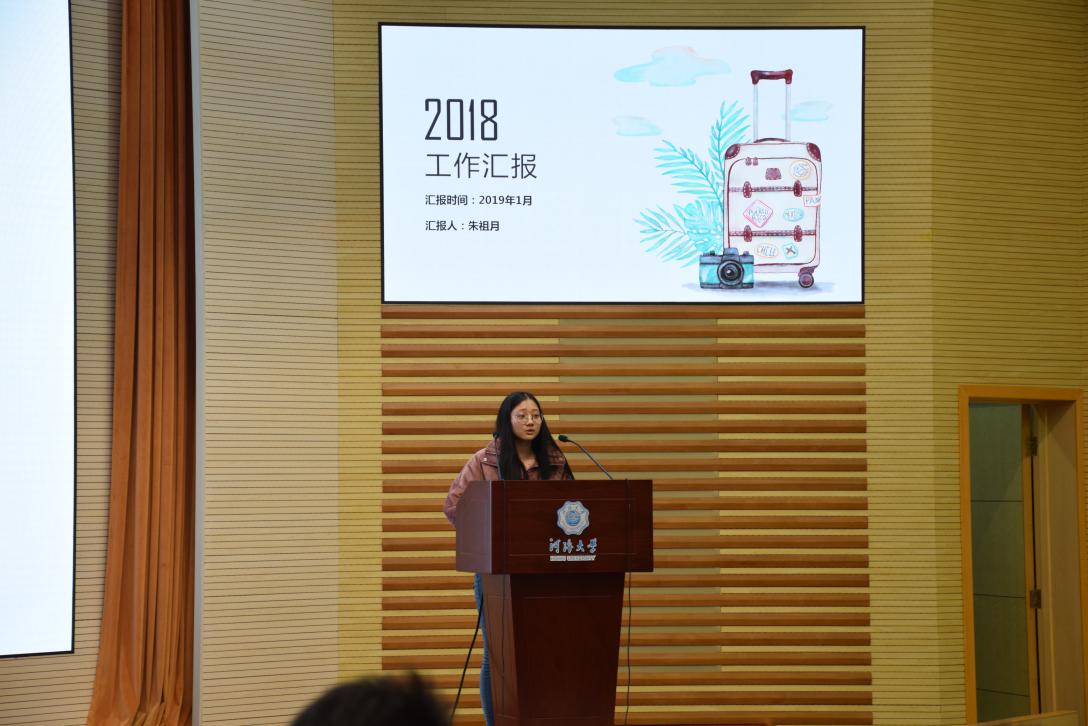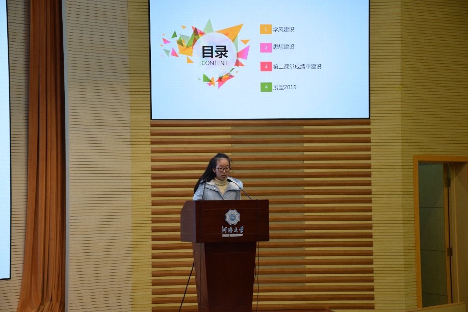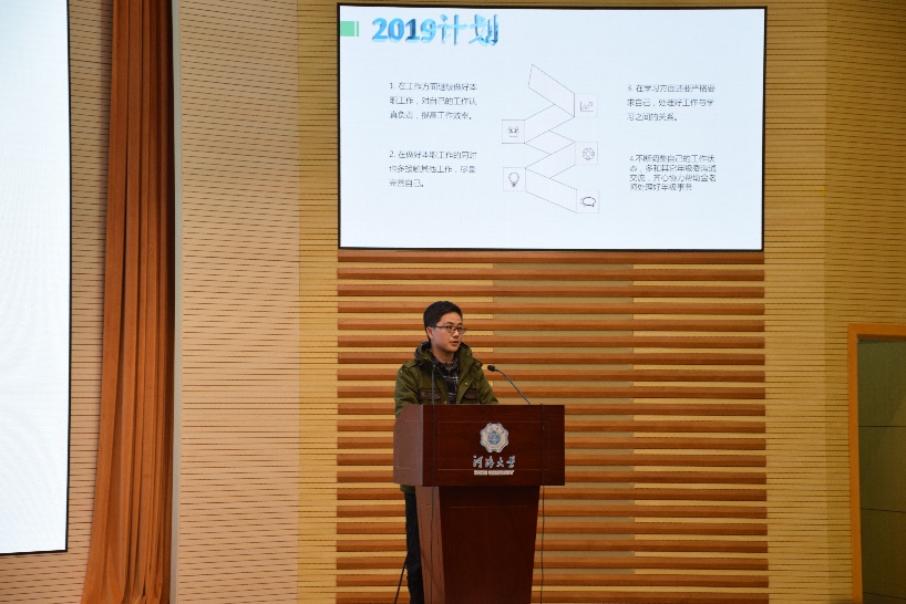 第二项内容是员工干部汇报。首先是党支部进行述职报告,接下来是各年级委员从年度工作总结、问题改进、2019计划等方面进行汇报,最后是各班班长从思想建设、学风建设、文化建设、PU第二课堂成绩单建设等方面对本班情况进行概括总结,并提出了2019年的相关计划。