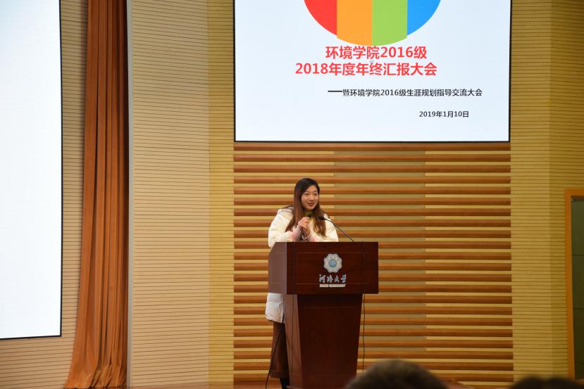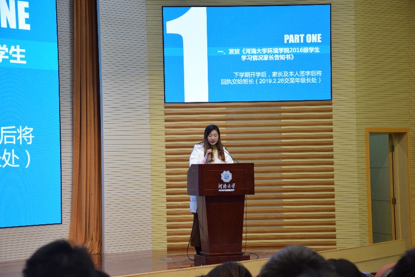 此次年级大会首先播放了一段主题为威廉希尔官网2016级本科生2018年度报告的视频,从学风建设、文体活动、精神建设等各方面进行总结。之后由辅导员金意倩老师进一步总结概括2018年各项事宜。