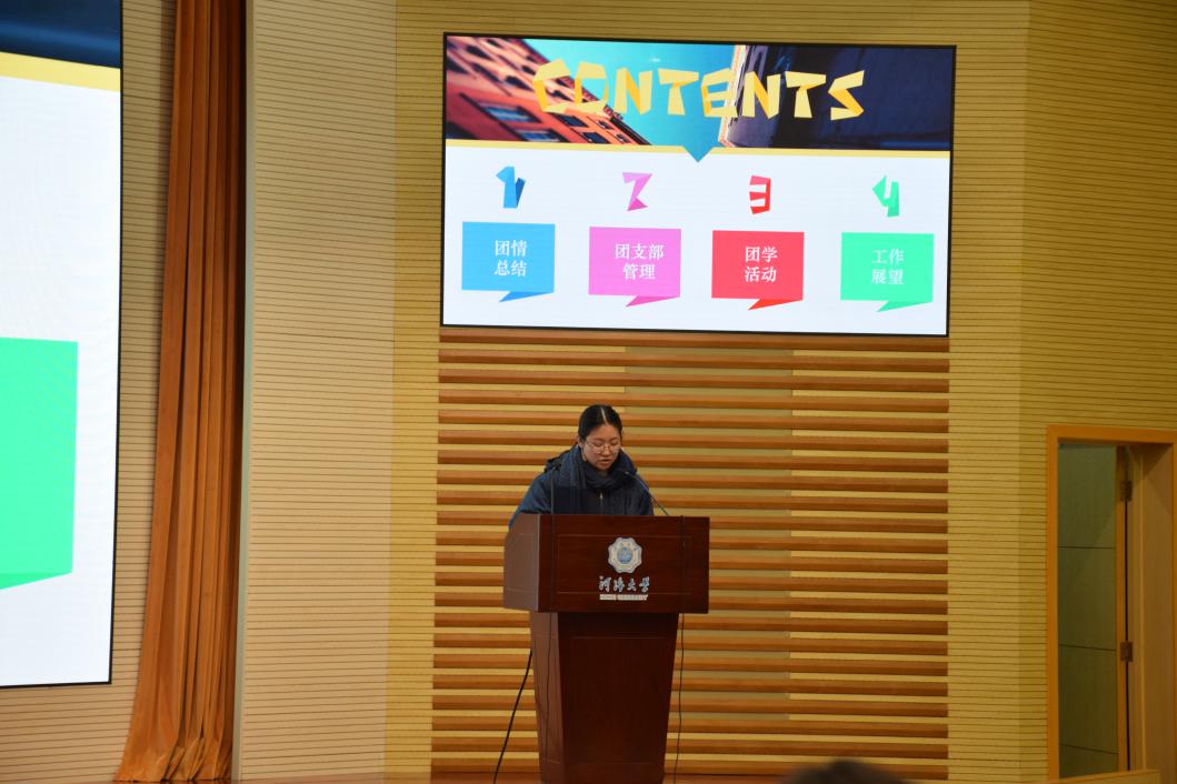 (左图为年级团支书李婉逸同学进行汇报,右图为年级生活委员岳楠进行年终汇报)