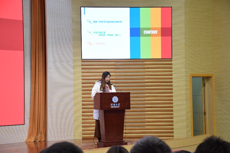 年级大会的第一项内容是由辅导员亲自发放《威廉希尔官网2016级员工情况家长告知书》,全体同学轮流上台领取。发放告知书是为了家长能更好地了解同学们在校学习情况,以及让同学们意识到自己还有哪些不足之处。