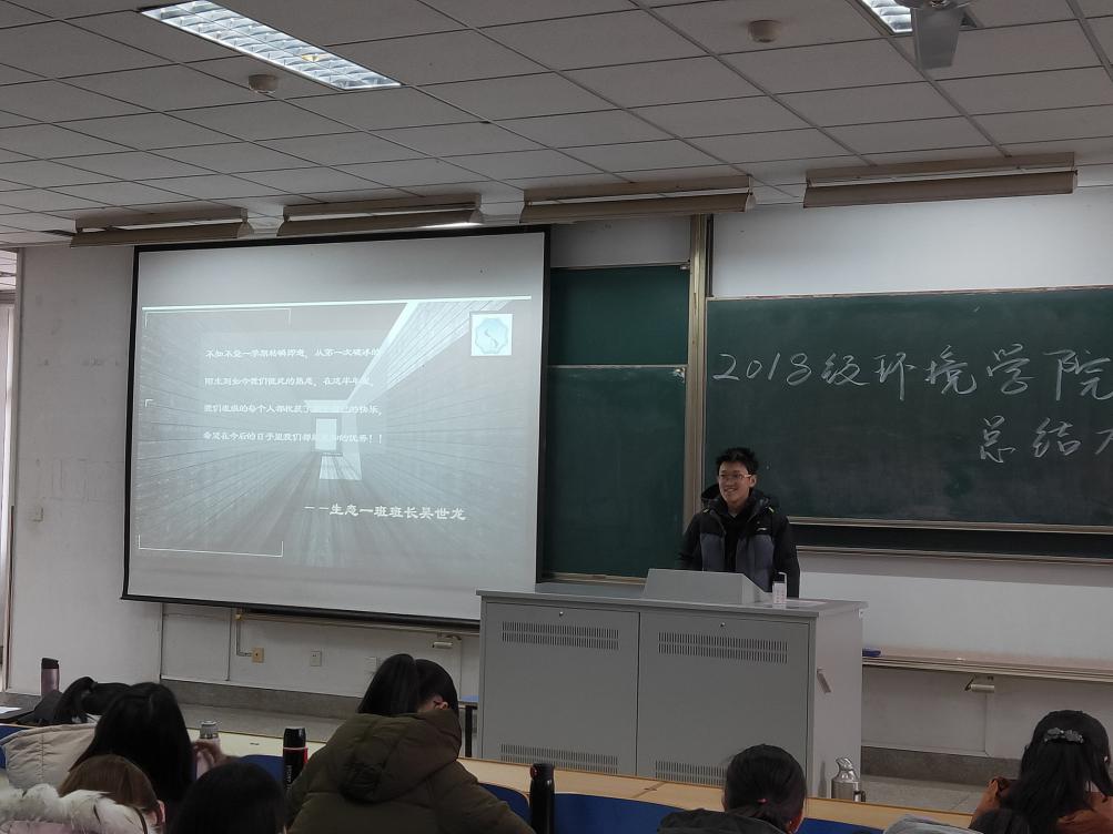 吴世龙同学用丰富的图片展示了生态一班在本学期中融洽的同学关系和开展的众多活动,展现了良好的班级氛围,然后通过思想引领和学风建设两方面总结了学期的工作。