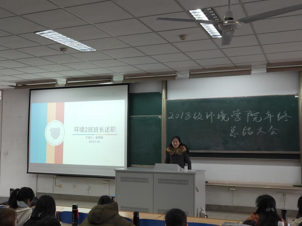 赵雨嫣同学以班级及学风建设、思想引领、展望未来、总结四个方面进行述职。环境二班在本学期通过丰富的课外讲座和公益活动,为同学们增加了很多课外知识和技能,营造了良好的班级氛围。