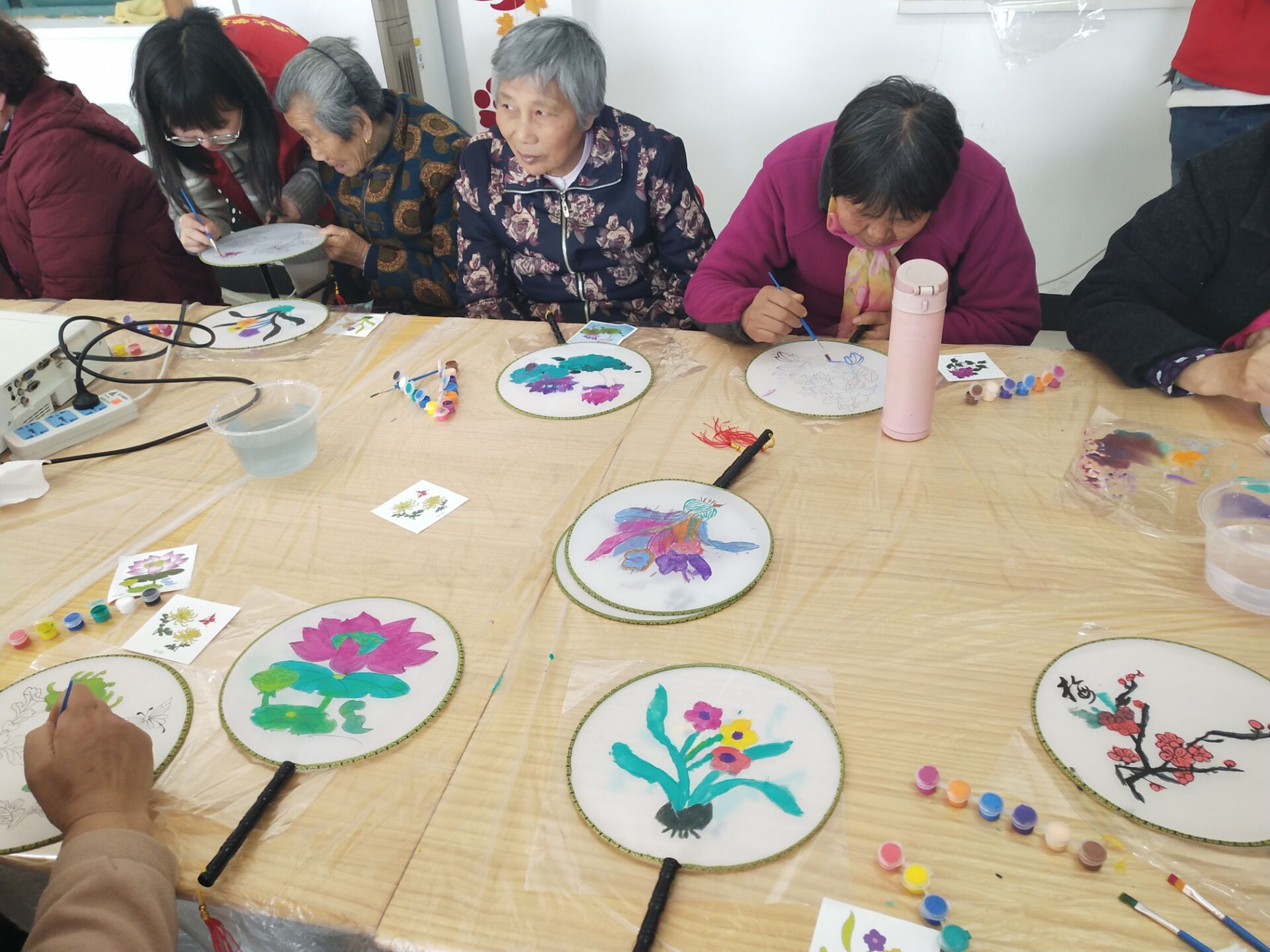 中午12点,志愿者们在东门地铁口集合,随后便乘车来到了东山街道邵圣社区居家养老服务中心。本次活动的主题是制作团扇。在老人到齐之后,志愿者们给老人们每人都分发了团扇及颜料。老人们在拿到了扇面及颜料之后,便开始了团扇的制作。老人们拿着图样,对比着效果图的颜色给扇面上色。志愿者们热心地给老人讲解着上色的方法,或是帮助着老人们在扇面上涂着各式各样的颜料。志愿者们与老人们亲切地交谈着,与老人们开心地互动,让老人们很是开心。很快,老人们的团扇便有原先单调的白色背景变成了五彩斑斓的生动画面。老人们对这次的团扇制作都十分满意。
