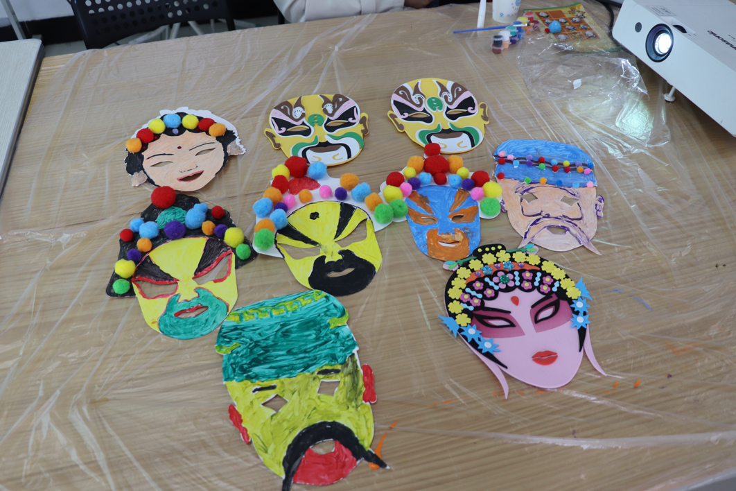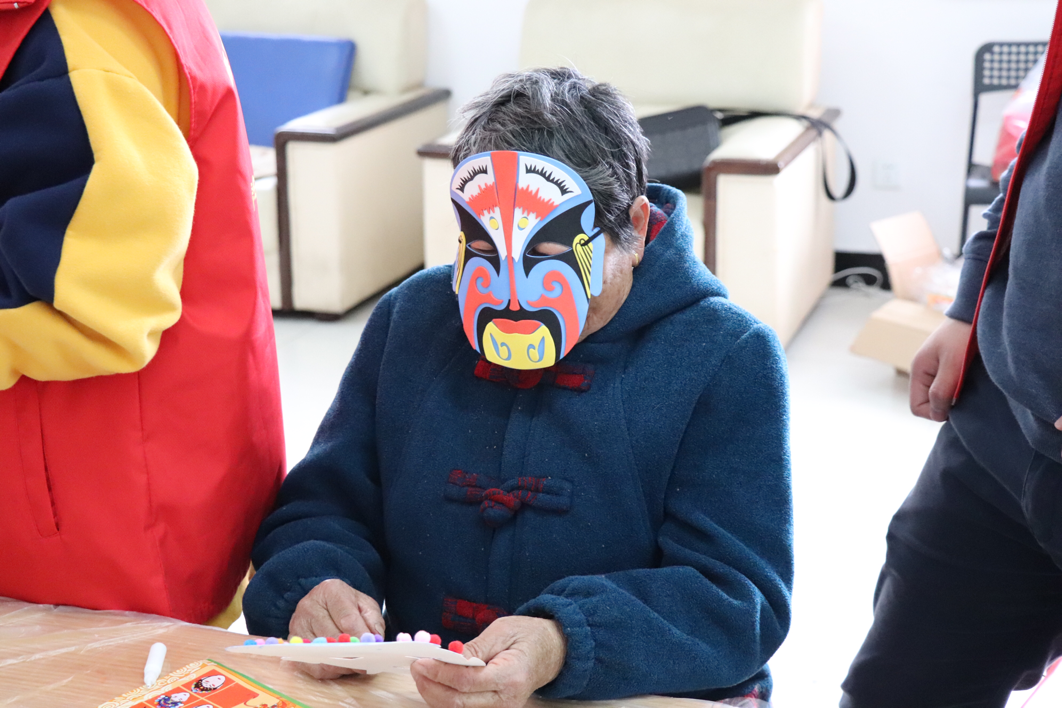 脸谱制作完成后,老人们试戴了自己制作的脸谱,纷纷露出了满意的笑容。