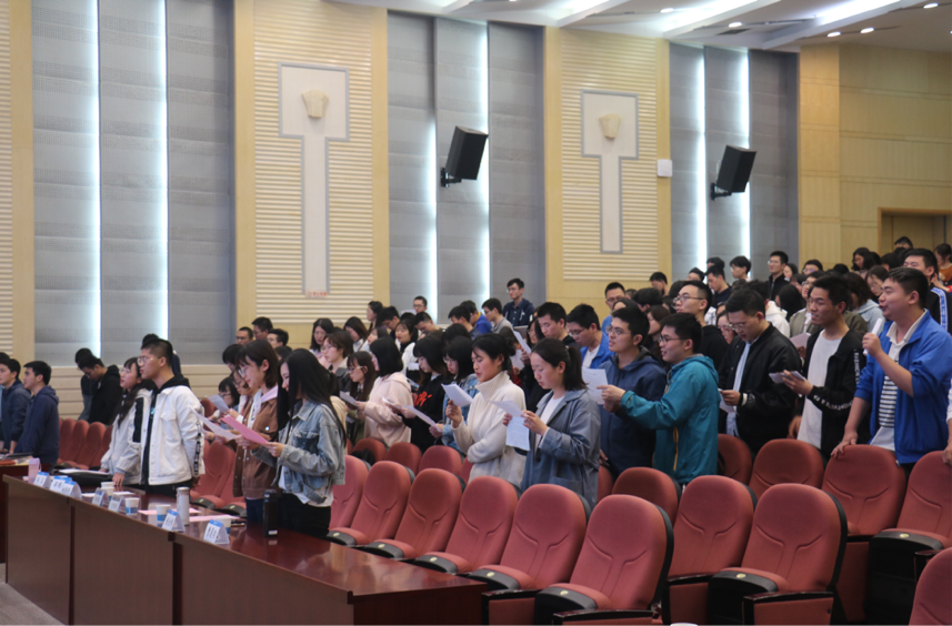 最后,大会进入最后流程,2016级全体员工进行宣誓倡议。努力课堂学习做到“三不一争取”,课堂不玩手机,不吃东西,不迟到早退,争取坐前排提高效率。同学们的集体宣誓铿锵有力,掷地有声,相信同学们一定会坚定信念,努力做到“三不一争取”,创建更加优良的学风。