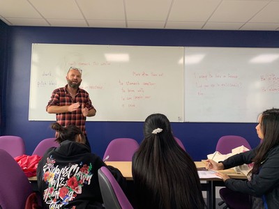 上午英语提高课程期间,同学们接受的是全英文教学,需要与来自不同国家的老师和同学合作学习。同学们学习的内容无所不涵:从电影,音乐,文学,文化,到旅行,美食,科技,互联网,每节课老师都为同学们精心准备和安排,鼓励同学们大胆地用英语交流。同学们也被依照各自的长项与弱项分到了不同类型的班级,从而让每个人尽可能得到最合适的教学方式和内容。课堂以开放性课堂的形式展开,同学们通常以小组形式完成老师的任务,老师随时欢迎员工提出问题和质疑,也会参考课堂效果与同学们的兴趣进行话题的改变或延伸讨论。所有同学都尽可能地被安排和来自其他国家的员工同桌,如此不仅帮助提高了同学们的交流兴趣,也提高了英语口语沟通的必要性。