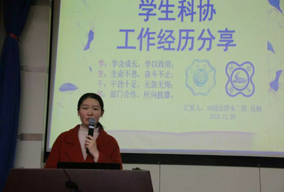 活动第二部分为优秀员工骨干经验分享,他们分别是2016级给排水二班的岳楠 ,2016级环境专业的郑天铭,2016级给排水专业的司佳蕾。