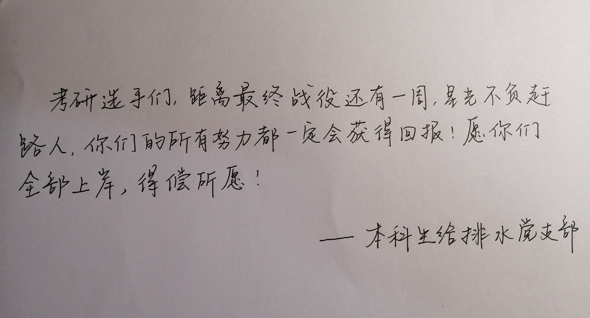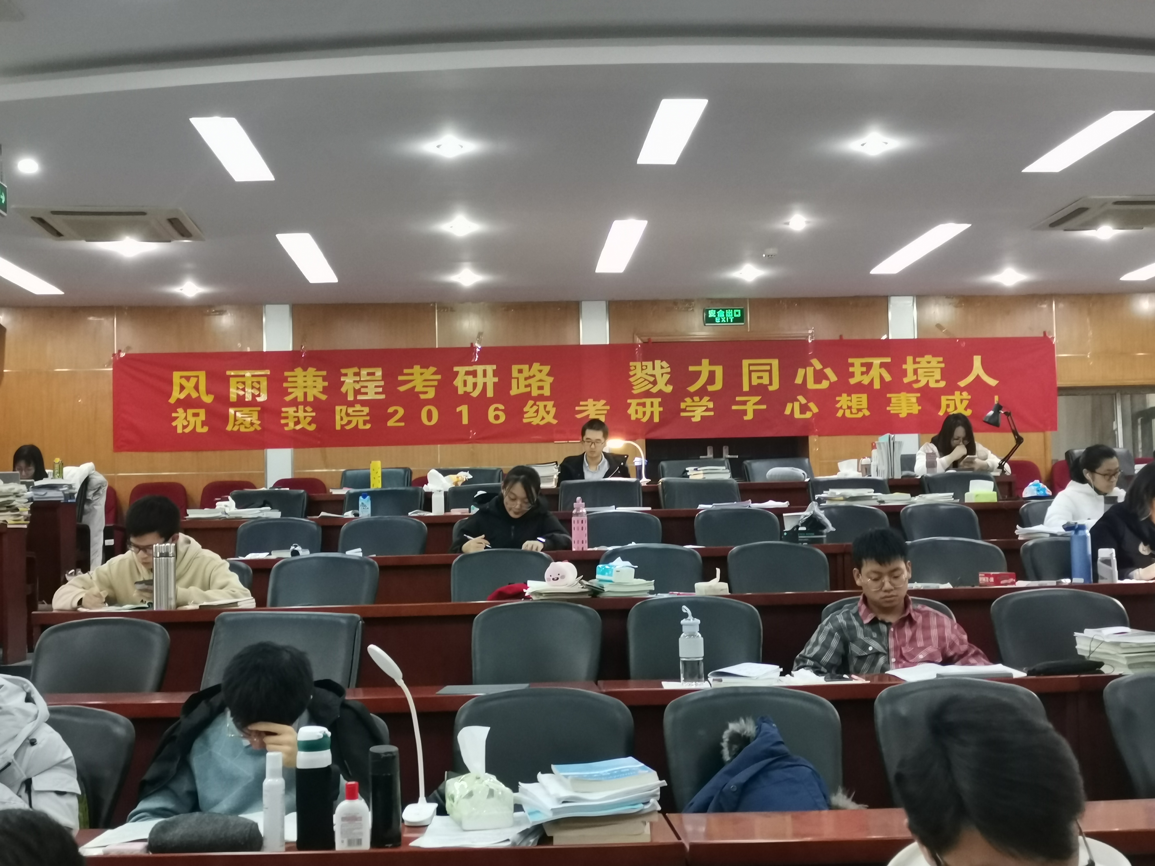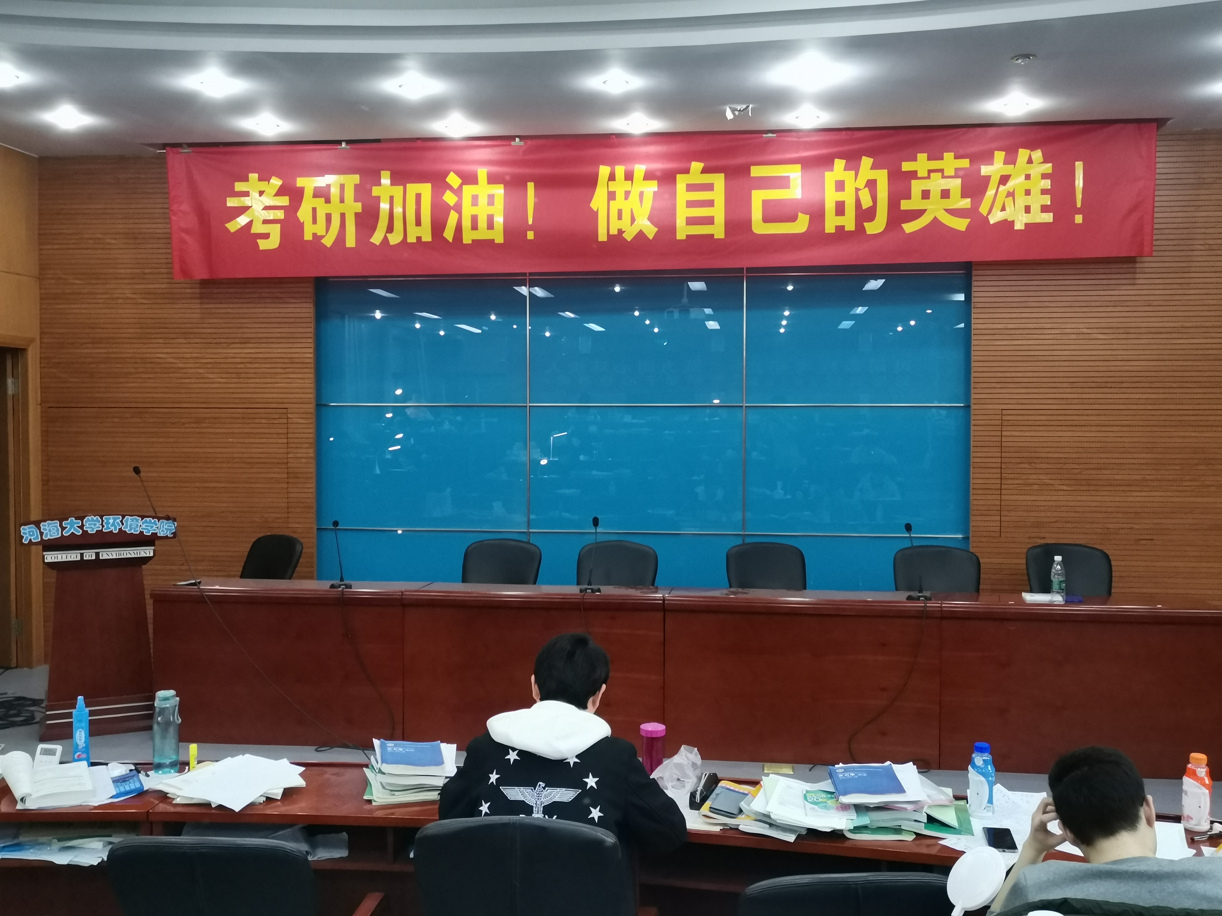 除此之外,为了让同学们能以更好的状态准备考研,威廉希尔官网给予了十足的关怀。在学习方面,学院特地向学校申请了水利馆301的会议室作为威廉希尔官网同学们的专用考研复习教室,给同学们提供了一个固定而温暖的学习空间,为同学的复习生活提供了极大的便利。在生活方面,学院在快要来临之际举办了考研动员大会,鼓舞考研同学的士气,缓解大家的紧张与压力,让同学尽量以最佳的心态复习应试,同时也为员工的复习计划提供了参考经验。学院还精心订制了条幅展示于考研复习教室的前后,让大家在学习之余能够感受到学院老师和同学们的鼓励,希望同学能够心想事成、不负青春、做自己的英雄!