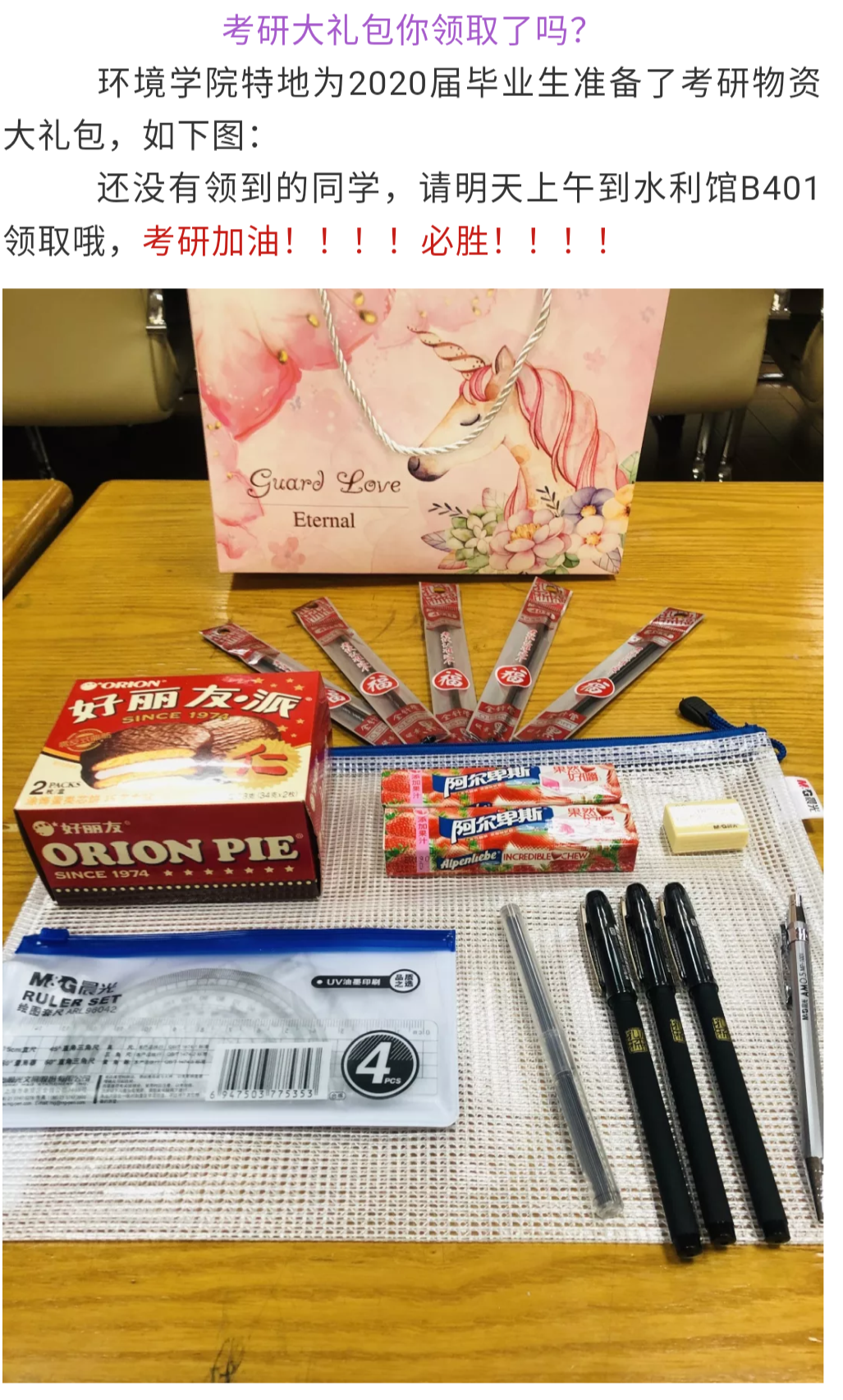 同学考研的紧张气氛渐浓,威廉希尔官网特地策划本次系列活动,辅导员金意倩老师和年级长牵头,年级及班级文艺委员协助组织实施的考研大礼包放送活动也顺利地开展,在活动现场,辅导员金意倩老师帮助同学们排忧解难、扫除心理障碍,同时给同学们加油打气:“考研并不是某种意义上的一个终点,而是一个起点,同学们在其中只需要享受这个过程就足够,结果顺其自然,青春也就无悔。”辅导员金意倩老师的一字一句都鼓舞着每一位威廉希尔官网考研学子,除此之外,为2020届毕业生准备了考研物资大礼包,其中包含了同学复习时会用到的铅笔橡皮、若干水笔、套尺、补充能量的零食,还准备了应试时需要带入考场的文件袋,从物质上给予了同学支持,让同学感受到了学院对考研同学的支持与鼓励。