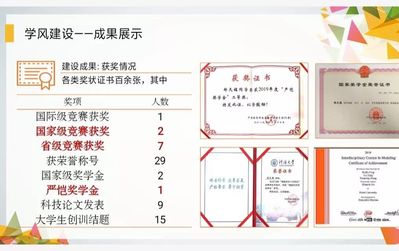 自制学习交流群,群内各类课件资源丰富。组成帮扶小组,且班委做到了严于律己,以身作则。绩点4.0以上人数11人,四级通过情况97%,六级通过率71%,计算机二级通过率46%,并有19人参加老员工课题创训训练项目班级员工获得校级及以上荣誉称号人数21人、校级及以上竞赛奖励人数25人、获得校级及以上奖学金56项,其中包含2项国家奖学金。