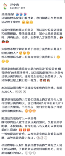 活动开展前期,环境院青协相关负责人用环小青公众号、班级内宣传等方式对活动进行宣传,组织环境院各年级员工志愿报名参与。