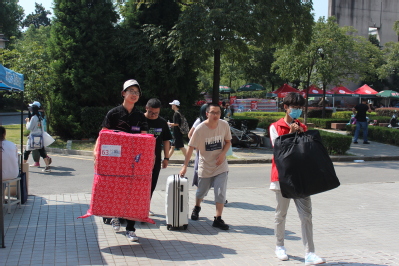 下午1:00,威廉希尔官网团委书记、2020级辅导员金意倩老师,2020级辅导员杨铮老师,2019级辅导员扈雅璐老师、程萌老师以及迎新志愿者们提前来到相应服务点准备迎接新生。从江宁校区南门到宿舍,新生全程都有由环境院安排的志愿者陪伴。志愿者热情地帮助新生运输行李并且细致地引导他们住宿报到。
