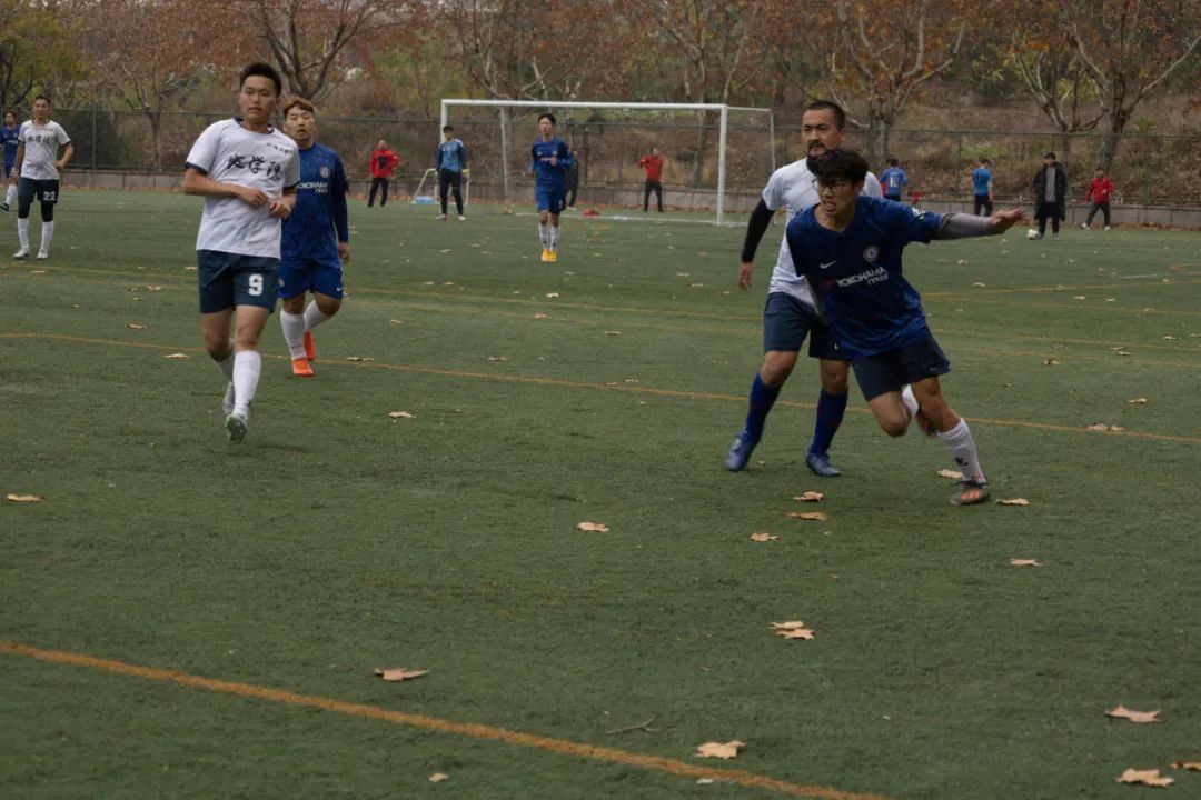 上半场比赛一开始,身着蓝色球衣的环境院球员们便与穿着白色球服的地学院的球员们展开了拉锯战。控球、传球、过人、防守、射门、扑救,球员们在绿荫场上奋力地奔跑,彰显着青春的风采。最终,在裁判的又一声哨响后,上半场比赛结束,球员们进入休息阶段。