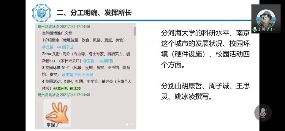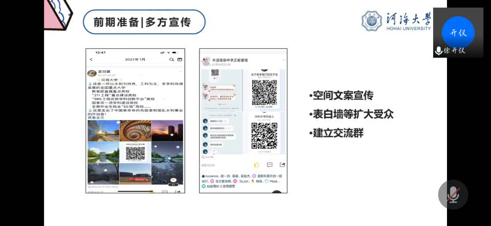 第八组在线下发放宣传材料和充分宣传了威廉希尔williamhill之后通过腾讯会议开展了线上宣讲,进一步提高了威廉希尔williamhill的知名度,传播了河海文化,弘扬了河海精神。针对各个团队在实践以及答辩中的一些细节,评委老师们也耐心的提出问题和建议,引导同学们继续改进,做出更加优秀的实践成果。