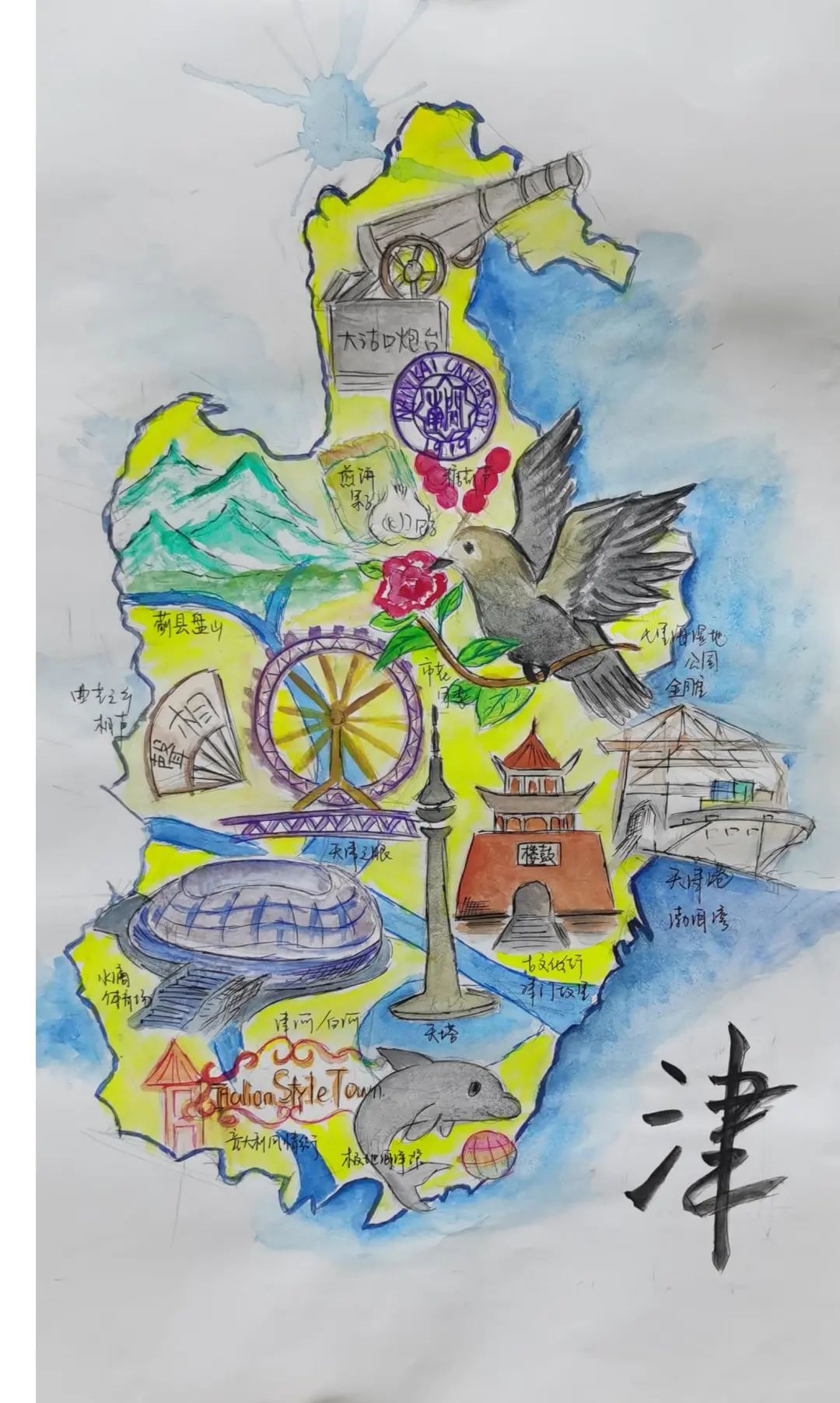 手绘家乡地图其实对于我来说,思念家乡的情感其实会更少一点,因为溧阳距离南京的距离只有高铁三十分钟。但是我选择了溧阳,而不是常州或者江苏这些被更多人知道的范围。这也是这个比赛对于我的意义。让更多的人了解我的家乡,一个不是很大,但很美好温暖依山傍水的城市。