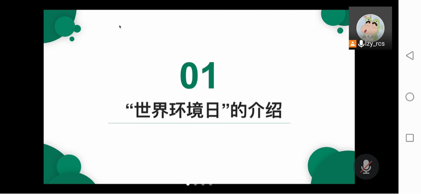 首先主讲人向大家介绍了“世界环境日”,让同学们对世界环境日有了初步的了解与认识:世界环境日为每年的6月5日,今年“世界环境日”的主题是“人与自然和谐共生”。世界环境日反映了世界各国人民对环境问题的认识和态度,表达了人类对美好环境的向往和追求,也是联合国促进全球环境意识、提高对环境问题的注意并采取行动的主要媒介之一。