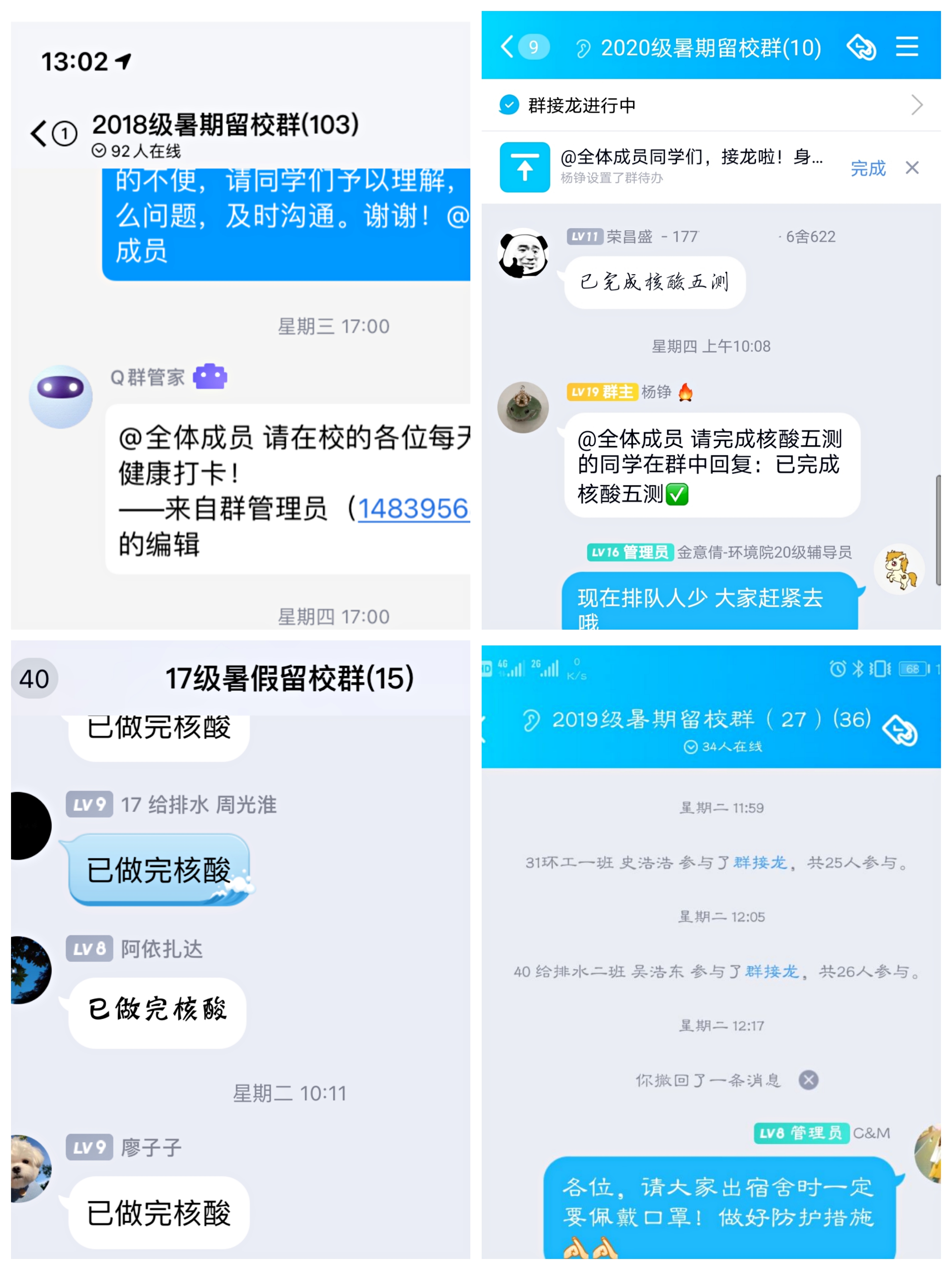 除此之外,身处全国各地的河海环境学子们响应号召纷纷行动,主动加入到街道社区的疫情防控中,以志愿者的身份为家乡人民奉献青年力量。