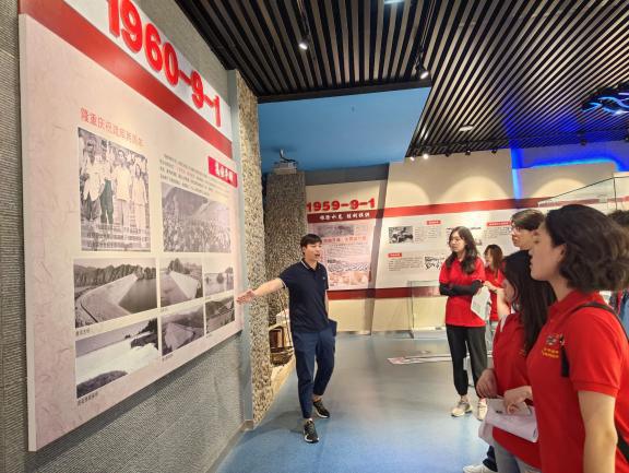 在密云水库展览馆,成员们跟随着解说工作人员徐徐前进,认真聆听。一幅幅珍贵的老照片、一件件泛黄的老物件展现了60年多来密云水库建设、守护的历程,从规划建设到拦洪竣工,从移民安置到水源保护,用五个篇章分别描述了密云水库的建设史、移民史和奉献史,及保水、富民的历程。讲解员为团队成员描述了水库建立的历史背景以及九兄弟突击队、单臂英雄、十姐妹队、英雄风钻等英雄人物,他们不畏艰苦、献身担当的精神令成员们心生敬佩。他们也由衷感受到党的关怀如和煦的光播撒在密云青山绿水间,激励建设者们激情满怀,鼓舞密云人民继往开来。