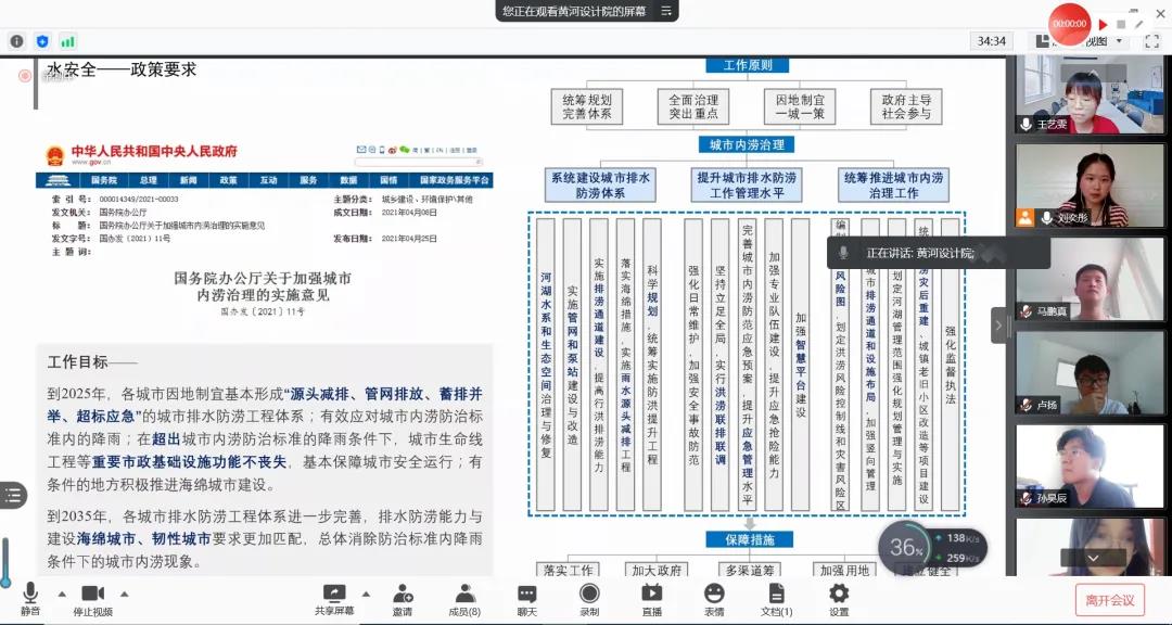 8月25日上午十点半,实践团连线黄河设计院,并与黄河设计院生态院团委书记赵地,生产经营管理部副主任刘信勇,生产经营管理部黄倩影,生态环境所鲍珊珊、张超,景观文化所曹平伟、张方方共同召开了腾讯会议。在会议上,实践团成员了解到黄河设计院在此次暴雨洪灾中积极应对,并在灾后及时总结问题所在。同时,实践团成员获悉,郑州地处淮河流域,本次郑州暴雨洪灾其实对黄河影响较小,并不会如群众所担心的,导致黄河发生大洪水。相比之下,像贾鲁河等淮河支流面临的压力更大。因此,做好群众科普,避免群众因谣言而导致恐慌是非常有必要的。
