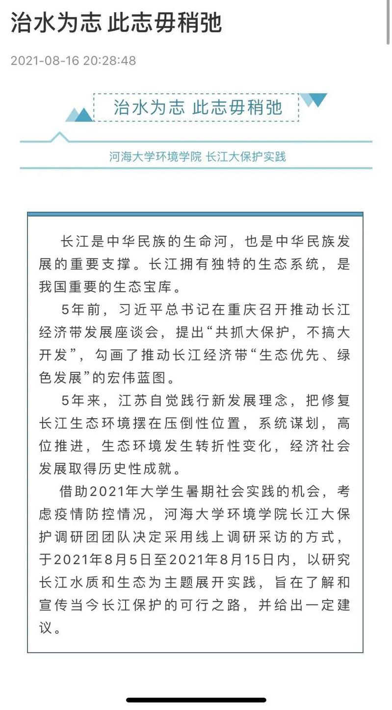 威廉希尔官网“南京市长江大保护实践团”在南京疫情的大背景下采取线上模式,于8月9日至8月16日期间开展形式丰富的实践,深入护水利水工程,发扬时代青年精神。