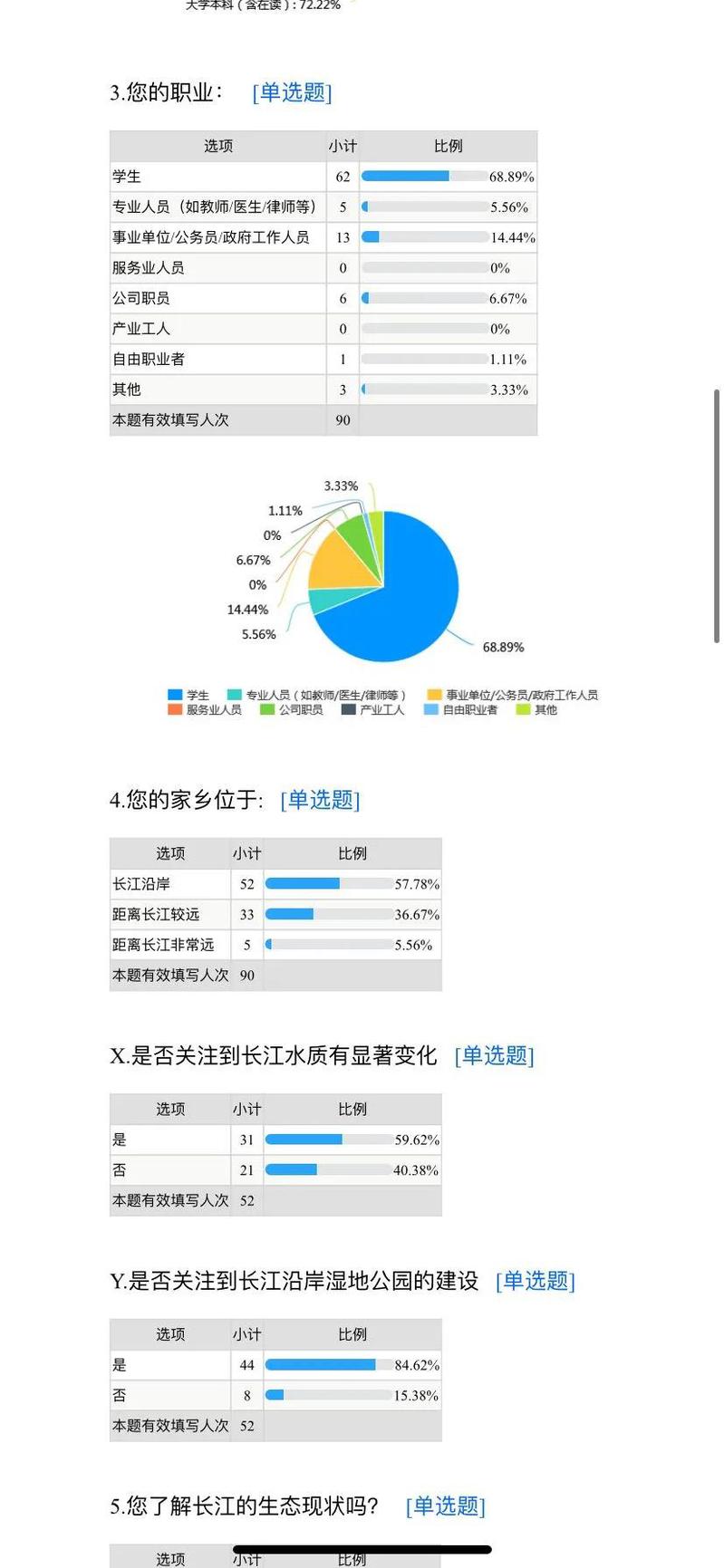 问卷调研分析环节,团队精心制作了一份普及性强的问卷,通过线上方式广泛发布,收集答卷信息。经过缜密的统计,团队结合问卷结果精心制作了南京居民关于长江大保护的调研总结,运用柱状统计和饼状图对得到的数据进行汇总,并对数据揭示的现象做了一份深度分析,从而总结得出长江保护目前的长处与不足,进而提出有针对性的建议,最大化的深挖了问卷的内核价值。
