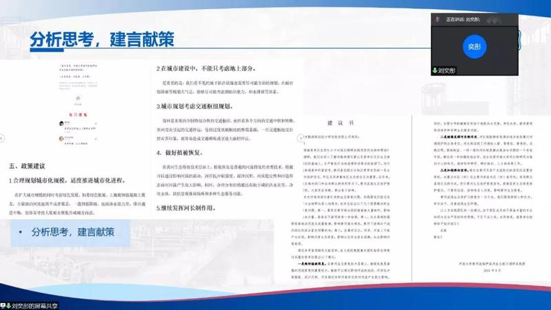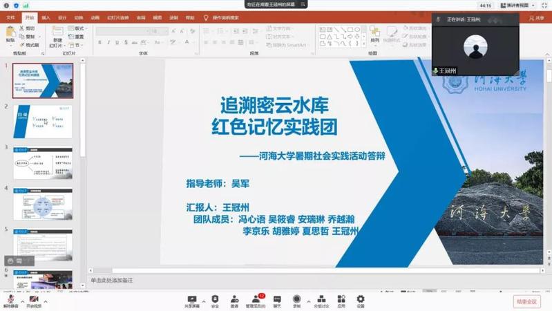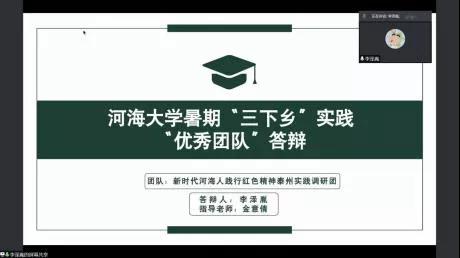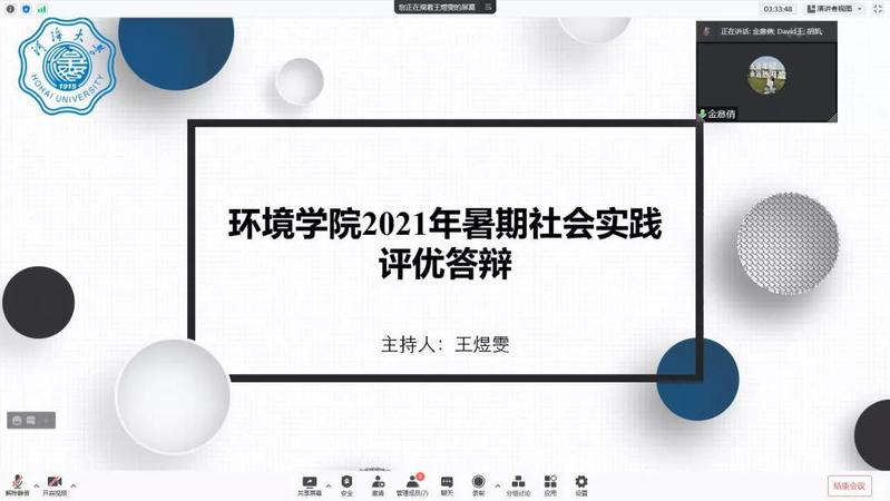 为推进落实威廉希尔官网暑期“三下乡”社会实践活动总结工作,2021年9月15日下午,威廉希尔官网举行了2021年暑期实践线上评优答辩。市政工程系胡凯老师,环境工程系王大伟老师,院团委书记兼20级辅导员金意倩老师、20级辅导员杨铮老师担任评委。疫情的特殊情况给今年的社会实践团带来了机遇和挑战。虽然大部分团队的队员都居住在不同的地方,给线下活动带来了不便,但是实践团使用了线上会议、网上问卷、就近走访等多种途径解决问题,并且顺利地完成了实践活动。线上答辩由团队借助PPT形式进行实践总结以及评委提问两个环节组成。主持人王煜雯同学简要地介绍了此次答辩的背景和评选标准后,答辩正式开始。